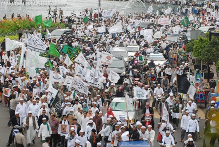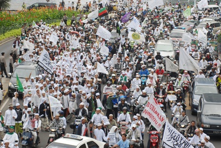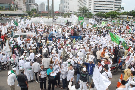 Massa yang diperkirakan berjumlah puluhan ribu itu menuntut pembubaran Ahmadiyah kepeda pemerintahan SBY. Mereka menyatakan SBY telah gagal dalam menjalankan roda pemerintahan. (mzs)