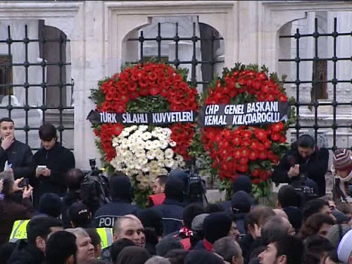 Suasana penuh haru di Masjid Fatih Istanbul dan penjaja keliling menjual syal yang dihiasi dengan pesan "Mujahid Erbakan", rakyat Turki menganggap Erbakan sebagai seorang prajurit suci, pada saat sebagian pelayat meneriakkan "Allahu Akbar" melepas kepergian Erbakan.
