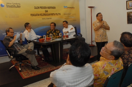 Diskusi ini membahas Wacana Calon Presiden Independen melalui Amandemen Konstitusi. Pembina Akbar Tanjung Institute, Akbar Tanjung, mengatakan pada sambutannya, bahwa wacana capres independen ini bisa mengubah UUD 45, karena dalam UUD 45 tidak dikenal capres independen. Berarti kita harus mengamandemen UUD 45, dan mengamandemen UUD harus melalui sidang di DPR. Sementara anggota DPR adalah wakil parpol.