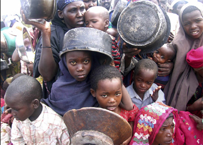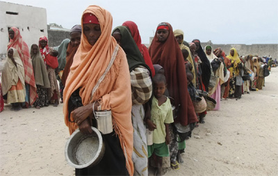 Warga Somalia termasuk anak-anak sedang antri jatah makanan di sebuah pengungsian di Mogadishu. Selama dua pekan pertama di bulan Juli, ribuan orang sudah mendatangi tempat-tempat pengungsian untuk mendapatkan bantuan makanan.