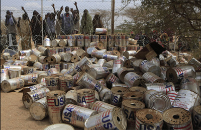 Inilah di antara kemasan makanan yang saat ini menjadi konsumsi sehari-hari warga muslim Somalia. Beberapa pihak memanfaatkan ini untuk mengambil keuntungan politik.