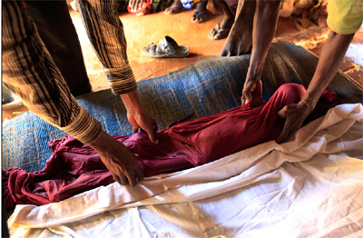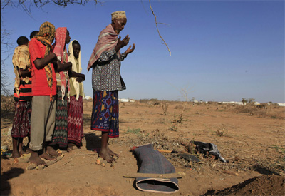 Sekitar enam warga Somalia sedang menyalatkan jenazah gadis cilik berusia 3 tahun, Nasro Ahmad Gure yang terbungkus dalam tikar plastik. Nasro meninggal karena kelaparan dan krisis gizi di pengungsian Dagahaley, Kenya.mnh/boston.com