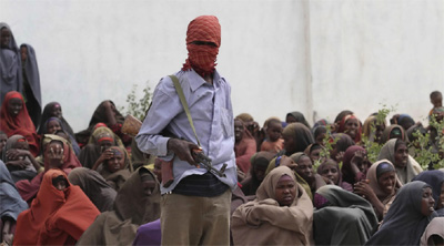Seorang pasukan dari faksi Asy-Syabab sedang menjaga ratusan muslimah yang ikut mengantri untuk mendapatkan makanan di sebuah pengungsian di Somalia. Konflik bersenjata memang terus berlangsung melibatkan pemerintah, mujahidin Somalia, dan pasukan dari luar Somalia.